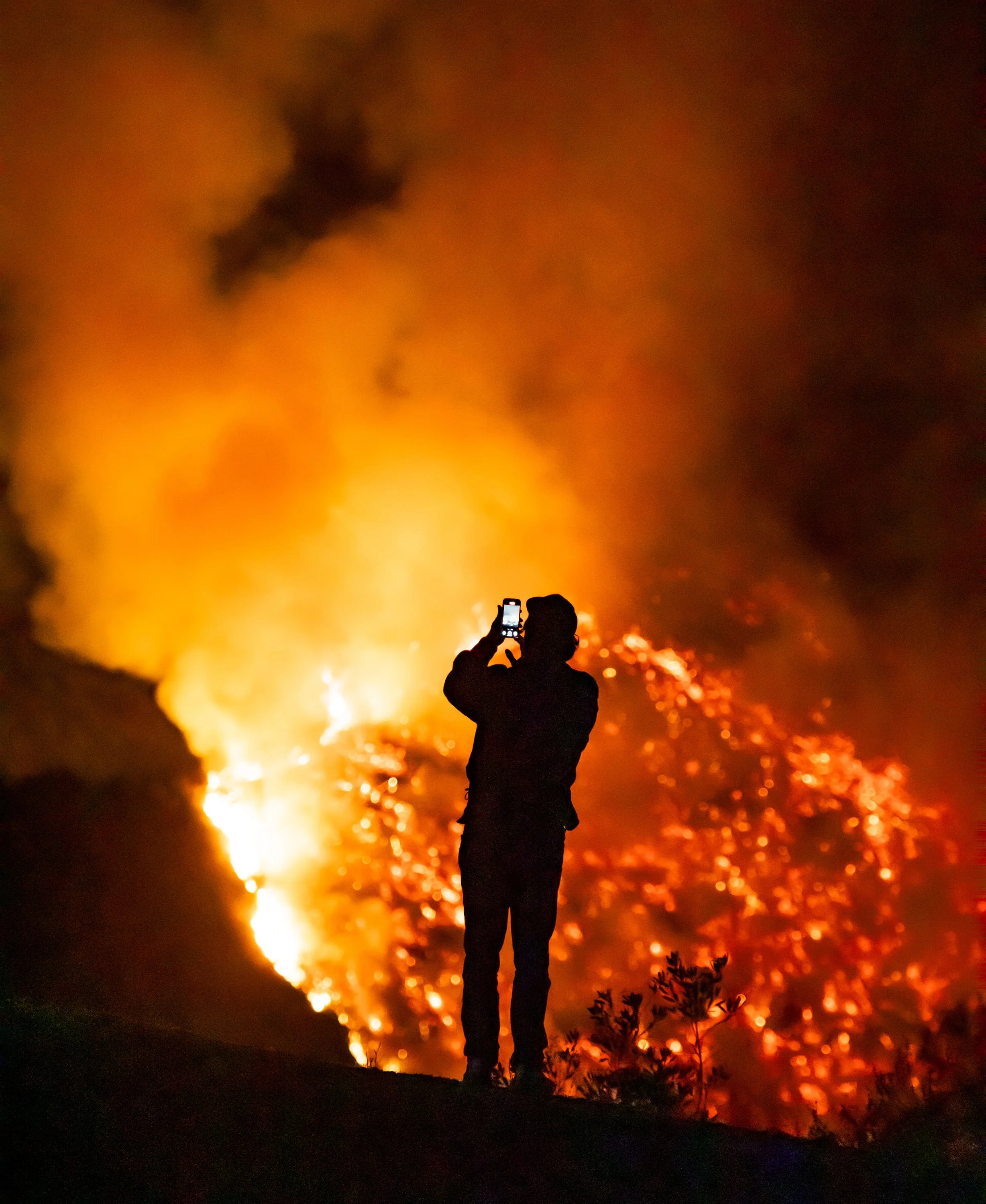 I found human stories and told then in both photographic still and followup interviews. On January 9th, as news anchors narrated the progress of a wall of flame descending into Mandeville Canyon, far below, hundreds of prisoners trained as firefighters, were cutting a line through the night like a human bulldozer, removing all vegetation in a twenty-foot-wide strip to stop it from spreading to the homes nearby. In the trenches, as fires flared in the chaparral with each gust of wind, and helicopters dropped loads of water on our heads, the soundscape was dominated by chainsaws and chopper blades and rockfall. Up and down near-vertical pitches I followed them as they battle through the night.